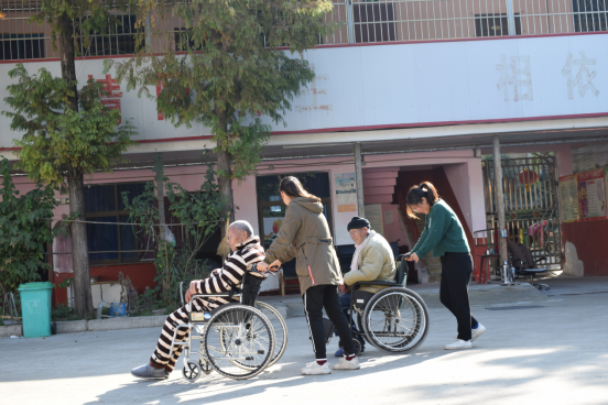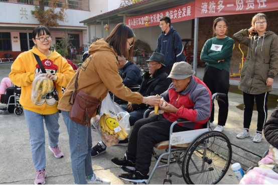 到达敬老院后,在老人们热情地欢迎同学们的到来之时,同学们也向老人们一一打了招呼进行了慰问。随后,同学们帮助工作人员将老人们推到院子里晒太阳并与老人们进行了亲切的交谈,并给老人们擦了脸、剪了指甲。同学们还将随行带来的零食、水果、牛奶等分发给老人并给老人们表演了精彩的节目,一时间敬老院内气氛十分活跃融洽。
