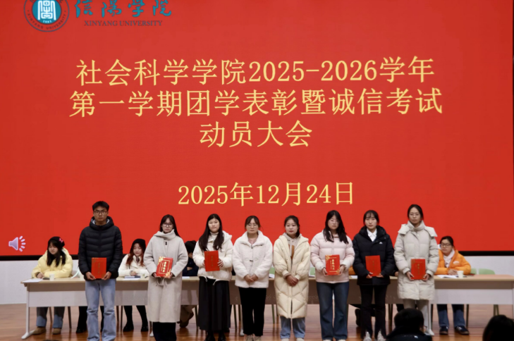 为深化团学建设、筑牢诚信考风,12月24日中午,社会科学学院在教二楼117报告厅召开2025-2026学年第一学期团学表彰大会暨诚信考试动员大会。学工负责人陈苗苗、团总支书记张雪梅、全体辅导员老师,以及学生会全体成员、各班班长、团支书参会,会议由鲁晨龙老师主持。