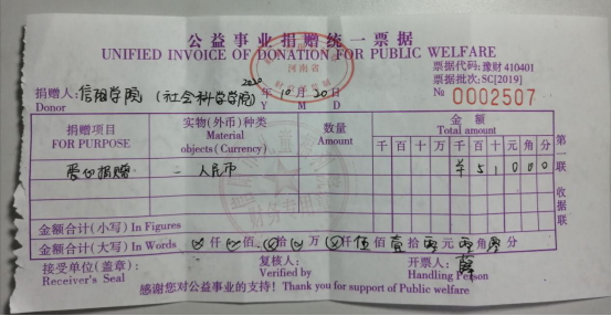三、开展自愿扶贫捐款活动。脱贫攻坚工作是一项长期而重大的任务,是一项崇高而伟大的事业。为有源头活水来,思想上脱贫远远大于物质上脱贫。社会科学学院团总支学生会充分调动学生积极性,依据本学院的工作特色,志愿服务队进行入班宣传,为大家讲解中国扶贫日的意义以及活动开展的目的。积极组织捐赠活动,严格坚持自愿原则,共募集510.5元,所得款项经过公示,最后捐于信阳市儿童福利院,积极为社会做贡献,扶危济困,争当表率。