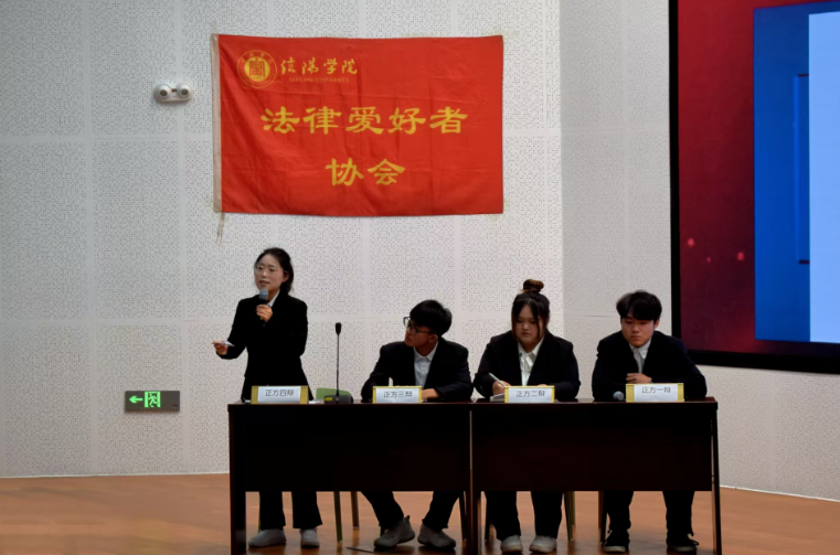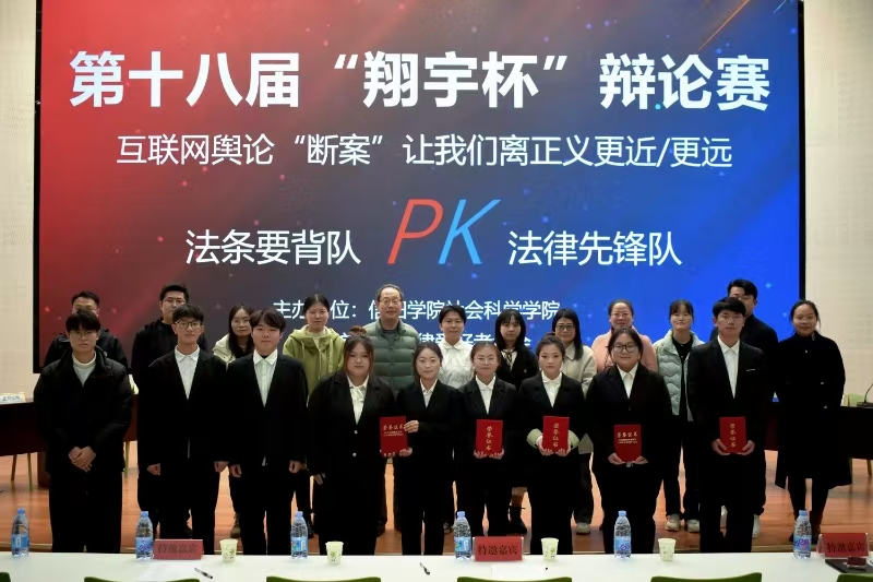 为践行习近平法治思想,加强校地合作,激发全校师生对法治的兴趣与热情,11月26日,由社会科学学院主办、法律爱好者协会承办的第十八届“翔宇杯”辩论赛在南湖校区教二楼117学术报告厅举办。本次辩论赛特邀信阳市中级人民法院法官戴玉曼、信阳市浉河区检察官游忆,以及河南涵信律师事务所律师张昊、刘玉凡莅临指导。出席本次辩论赛的领导老师有学院院长郭志祥,社团指导老师张雪梅、胡晶,法学专业骨干教师闫春丽、郝斌、刘君辉、陆田、王海云及辅导员老师。