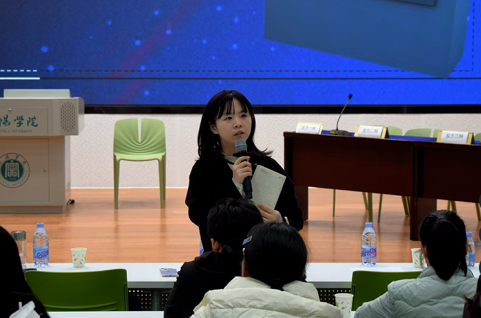本次辩论赛紧跟时事热点,以“互联网舆论‘断案’,让我们离正义更近/远?”为辩题,旨在引导大学生深入思考法律问题,锻炼法律思维。辩论赛以社团自制的短片《舆论的天平》拉开比赛序幕。赛事借鉴沿用奥瑞冈辩论赛制,即是在申论的基础上加入了“交互质询”环节。正反双方围绕辩题,运用大量的案例佐证己方观点,以敏捷的思维回应对方的问题,精彩的辩论引得在场评委和观众掌声连连。