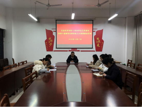 12月11日下午,社会科学学院在社科楼107会议室召开12月份学生工作会议暨辅导员素质能力大赛赛前动员会。党总支副书记胡志国、学工干事陈苗苗及全体辅导员参加了本次会议。会议由陈苗苗主持。