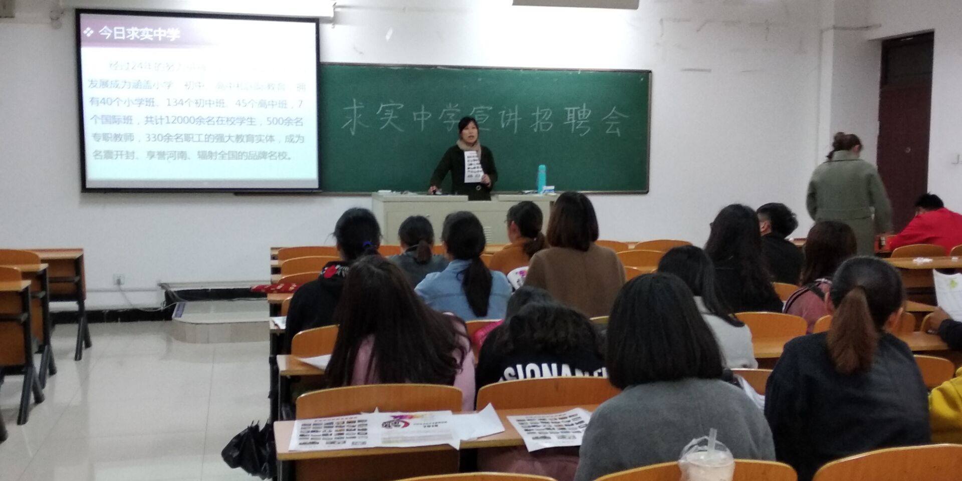4月13日下午,开封求实中学在我校社科楼215举行了招聘会,此次招聘会主要针对我校2014级教育学专业应届毕业生。