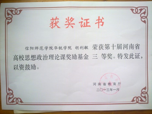 我系教师胡利敏在第十届河南省高校思政理论课奖励基金三等奖