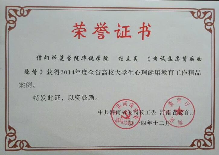 我系教师杨立昊作品荣获2014年度全省高校大学生心理健康教育工作