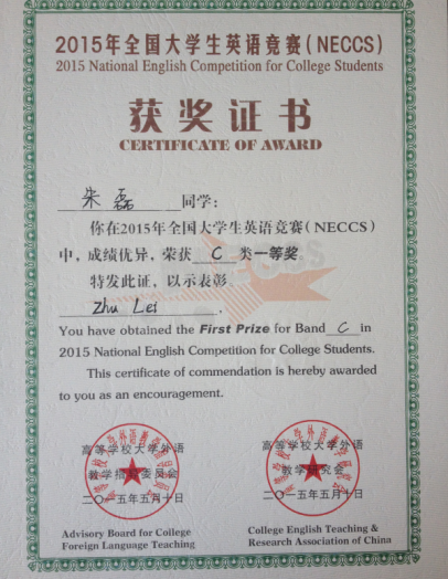 我系学生朱磊在2015年全国大学生英语竞赛中荣获一等奖