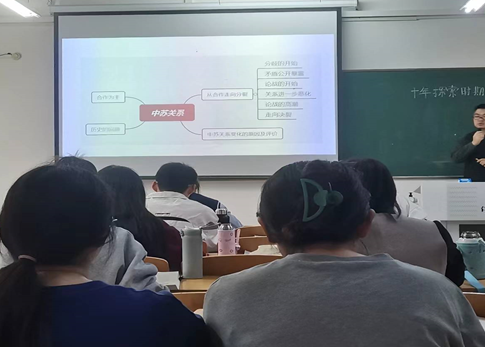 文星豪老师讲课的主题为《维护主权完整与对外关系的新进展》。他以8月份佩洛西窜访台湾事件导入新课,大大提高了学生的学习兴趣。在新课讲授中系统阐述了中苏关系在1956-1966年的演变。他将中苏关系分为历史的回顾、合作为主、走向分裂、中苏关系分裂的根本原因及其评价四个方面,基本完成教学目标。课后,骨干教师就如何进一步培养学生的逻辑思维、注意语调的抑扬顿挫、突出重点内容与文星豪老师进行了深入交流。青年教师在骨干教师的指导下,受益匪浅,逐渐成长。