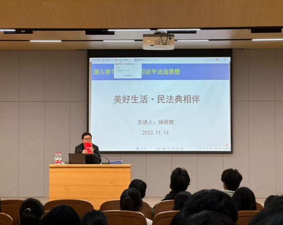 社会科学学院民法学教师徐战辉副教授主要讲解了以下内容。一是《民法典》编纂的重大意义。2020年5月28日,十三届全国人大三次会议审议通过了《中华人民共和国民法典》,自2021年1月1日起施行。2020年5月29日下午,中共中央政治局就“切实实施民法典”举行第二十次集体学习。习近平总书记指出,民法典共7编1260条、10万多字,是我国法律体系中条文最多、体量最大、编章结构最复杂的一部法律。实施好民法典,重点要加强民法典重大意义的宣传教育。《中华人民共和国民法典》是新中国成立以来第一部以“法典”命名的法律,是新时代我国社会主义法治建设的重大成果。民法典在中国特色社会主义法律体系中具有重要地位,是一部固根本、稳预期、利长远的基础性法律。实施好民法典,重点要加强加强民法典普法工作。民法典要实施好,就必须让民法典走到群众身边、走进群众心里。二是《中华人民共和国民法典》的七编制体例结构和具有中国特色、实践特色和时代特色的内容。三是以最高人民法院指导案例142号为分析对象,提出要重视民法典在案例判决中的解释适用方法,在具体案例中弘扬社会主义核心价值观,努力让人民群众在每一个司法案件中感受到公平正义。