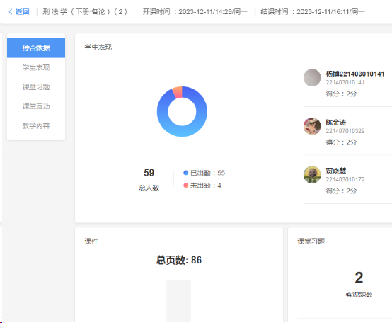 依托数字平台,利用数字技术优化课堂教学,探索信息技术与课堂教学的深度融合。通过使用雨课堂平台,教师备课思维模式和学生课堂学习方式都发生了积极变化。在备课过程中,闫老师借助雨课堂中的各类小控件,在课件中插入慕课视频、导入测试习题以及插入法治视频,使备课的资源更加丰富,同时也能督促老师考虑如何利用平台的功能来设计更有效的学习活动,促使学生刑事法治思维和法律应用能力等高阶能力的发展。