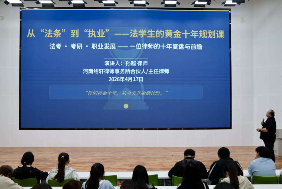 4月17日下午,社会科学学院特邀2015届法学专业校友、河南绍轩律师事务所合伙人、主任律师孙超返校,在南湖校区教二楼117学术报告厅为200余名在校法学专业学生开展专题讲座。此次讲座旨在为搭建实务界与校园沟通桥梁,助力法学生明晰职业发展路径。讲座由学院法学专业副教授张奎主持。