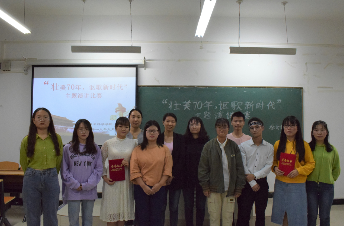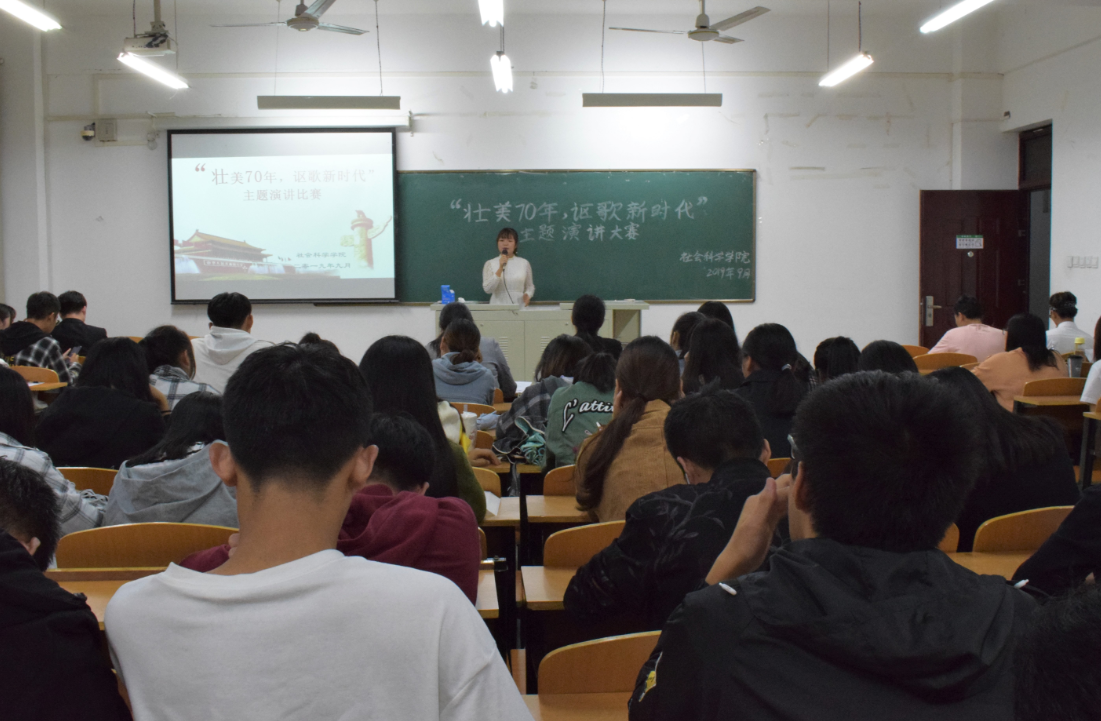 9月17日晚,社会科学学院在社科楼215举行“壮美70年,讴歌新时代”主题演讲比赛。本次比赛旨在广泛动员学生爱党、爱国、激励全体学生在祖国诞辰七十周年这个新时期担当新使命,谱写新篇章。辅导员曹惠、刘雪、余洁和部分学生代表参加了此次活动。