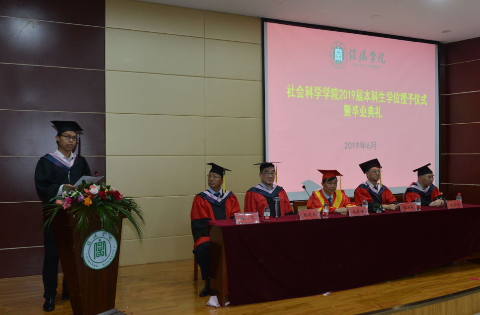 毕业典礼首先在雄壮的国歌声中拉开了序幕。接着,王娜老师宣读了《信阳学院社会科学学院2019届毕业生获得学士学位学生名单》,王晶老师宣读了《信阳学院社会科学学院关于表彰2019届优秀毕业生的决定》,程娇炎老师宣读了《信阳学院社会科学学院关于表彰2019届毕业生学习标兵的决定》。各位领导和专家分别为获奖同学颁奖,为全体毕业生正冠拨苏、授予学位并合影留念。
