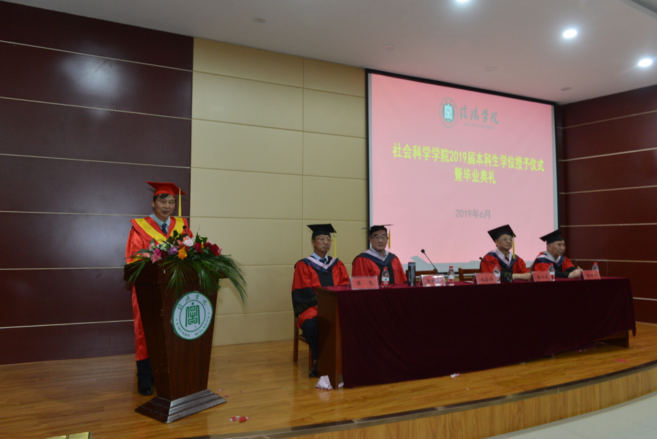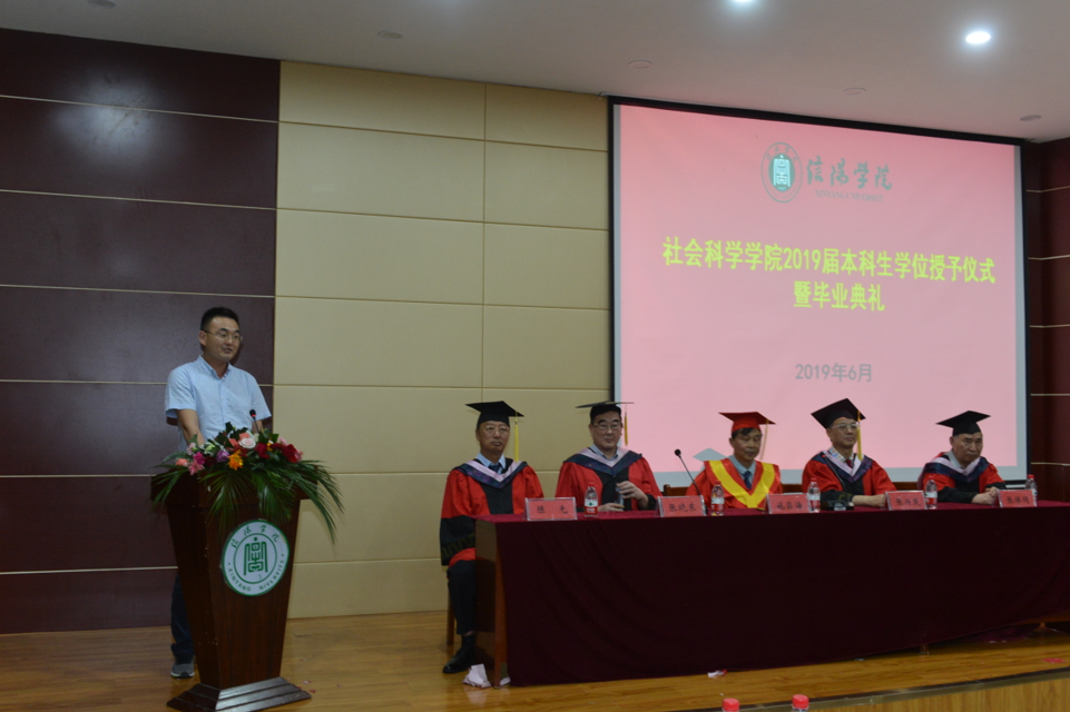 校党委专职书记施昌海教授作重要讲话:一是向全体同学表示祝贺。施书记指出,在座的各位同学在老师和学校的培养指导下,在自己的努力下,顺利地完成了四年的本科学业,获得了学位证及毕业证书,更为重要的是各位同学的专业能力和综合素养都得到了全面的提升。牛新原和吴晨昊同学参加信阳学院第十届“校园明星”汇报会,用自己的真实故事讲述了各自的成长经历和取得的收获,让出席活动的老师和同学们都深深感动。他们的成长过程和满满的收获也代表了我们社会科学学院甚至全校毕业生的成长与收获,充分体现了我们这一届学生良好的生活素质和成才成长的成果,非常令人欣喜。二是向大家表示祝愿。他祝愿同学们毕业以后,无论是走向工作岗位,还是继续深造,都要在新的旅程中再接再厉、继续前行,创造新的佳绩。成绩只代表过去,它的重要意义在于为自己的发展打下基础,但未来的发展如何,要靠我们付出新的努力。施书记最后衷心希望全体同学能够积极响应习总书记在纪念五四运动100周年大会讲话中对新时代中国青年提出的六点希望与要求,希望大家擦亮青春底色,不忘初心,砥砺前行。