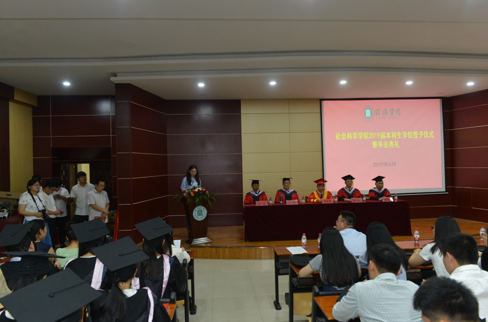 6月5日下午,社会科学学院2019届毕业生学位授予仪式暨毕业典礼在图书馆102报告厅隆重举行。校党委专职书记施昌海教授,社会科学学院名誉院长,特聘专家张晓东、张保同、陈光,学院班子成员,教研室主任及辅导员和全体2019届毕业生参加了此次学位授予仪式暨毕业典礼。典礼由该院党总支副书记胡志国主持。