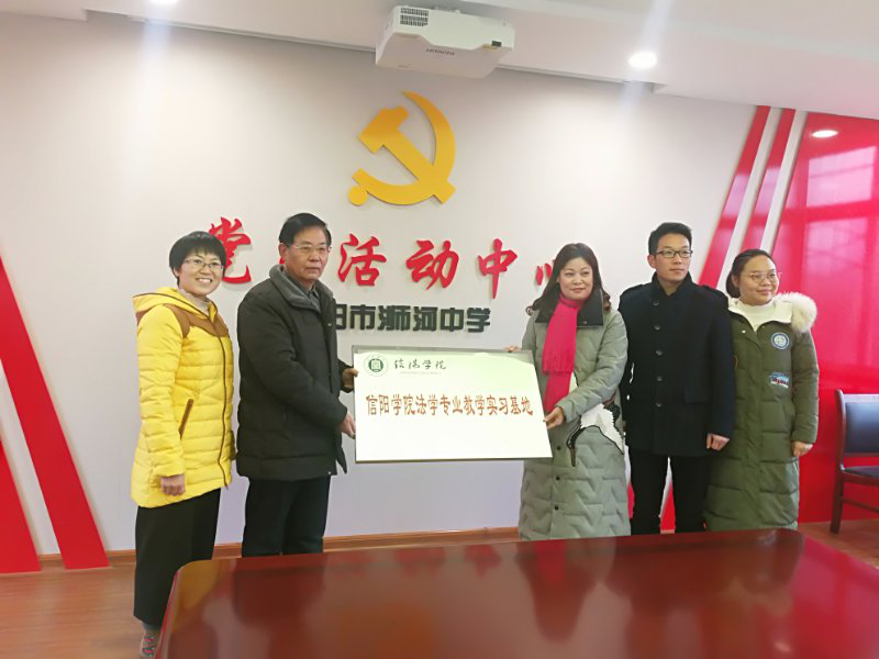 12月10日上午,社会科学学院院长陈录生、党总支书记李赟、学工秘书刘颖方、实践教学指导老师胡晶一行前往信阳市浉河中学与浉河中学王琴校长签署了联合建设法学实践基地协议书,随后举行了挂牌仪式。王校长对陈院长一行表示热烈欢迎,座谈中王琴校长首先对我校以往开展的法治讲座表示肯定和赞扬,并且表达了对信阳学院的法学专业师生以后能经常为浉河中学师生送上更多、更丰富的法治教育大餐的诚挚希望。随着法治教育已纳入国民教育体系,浉河中学每周四开展社团法治课,王校长也希望我校法学专业师生能为其此项工作的开展提供支持。陈院长对浉河中学为我校法学专业学生实践实习提供的平台表示感谢,并表示法学师生综合素质过硬,肯定能为浉河中学的法治教育填光添彩,双方领导商议随后将继续深入合作,并保持密切沟通。