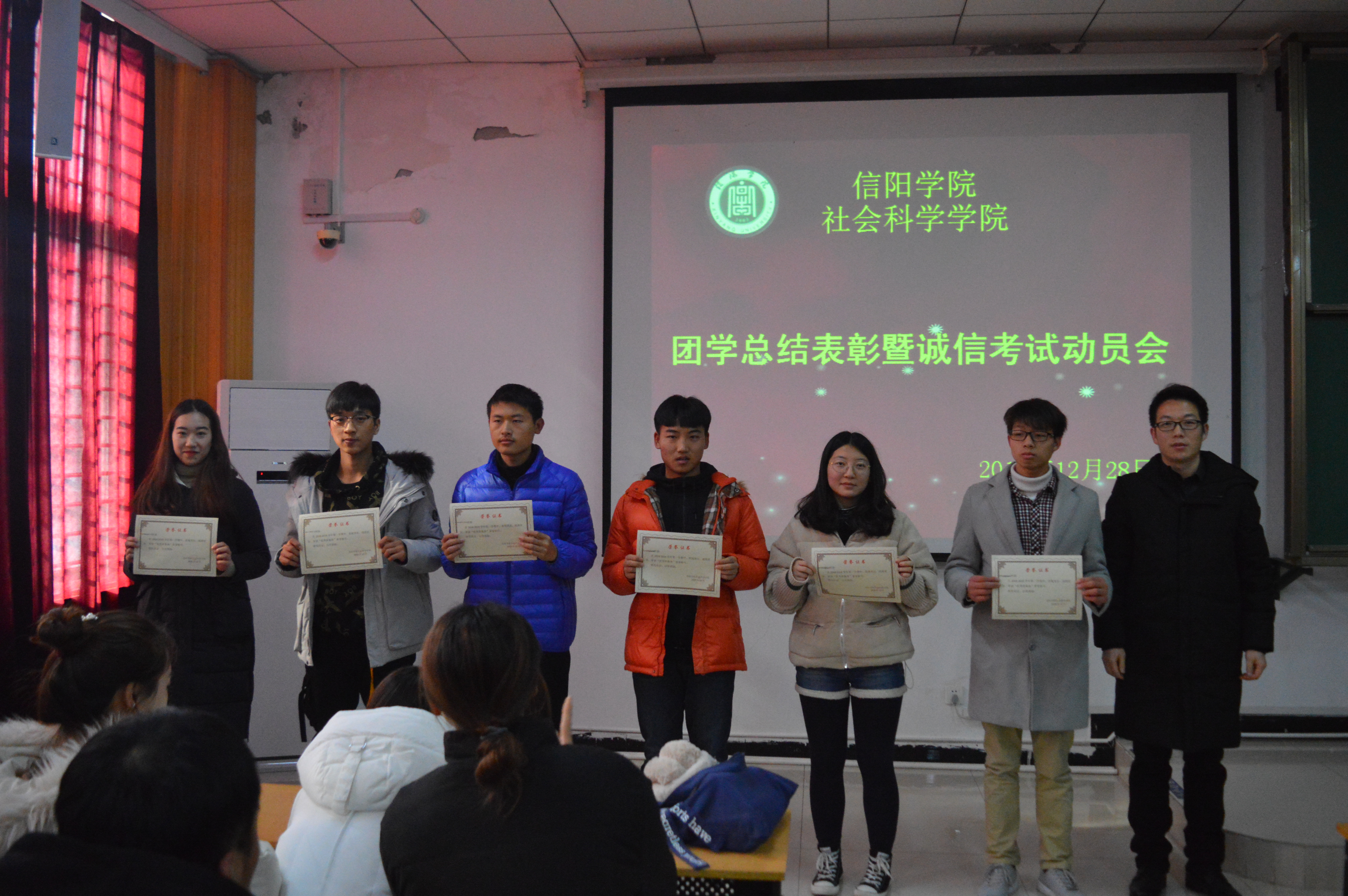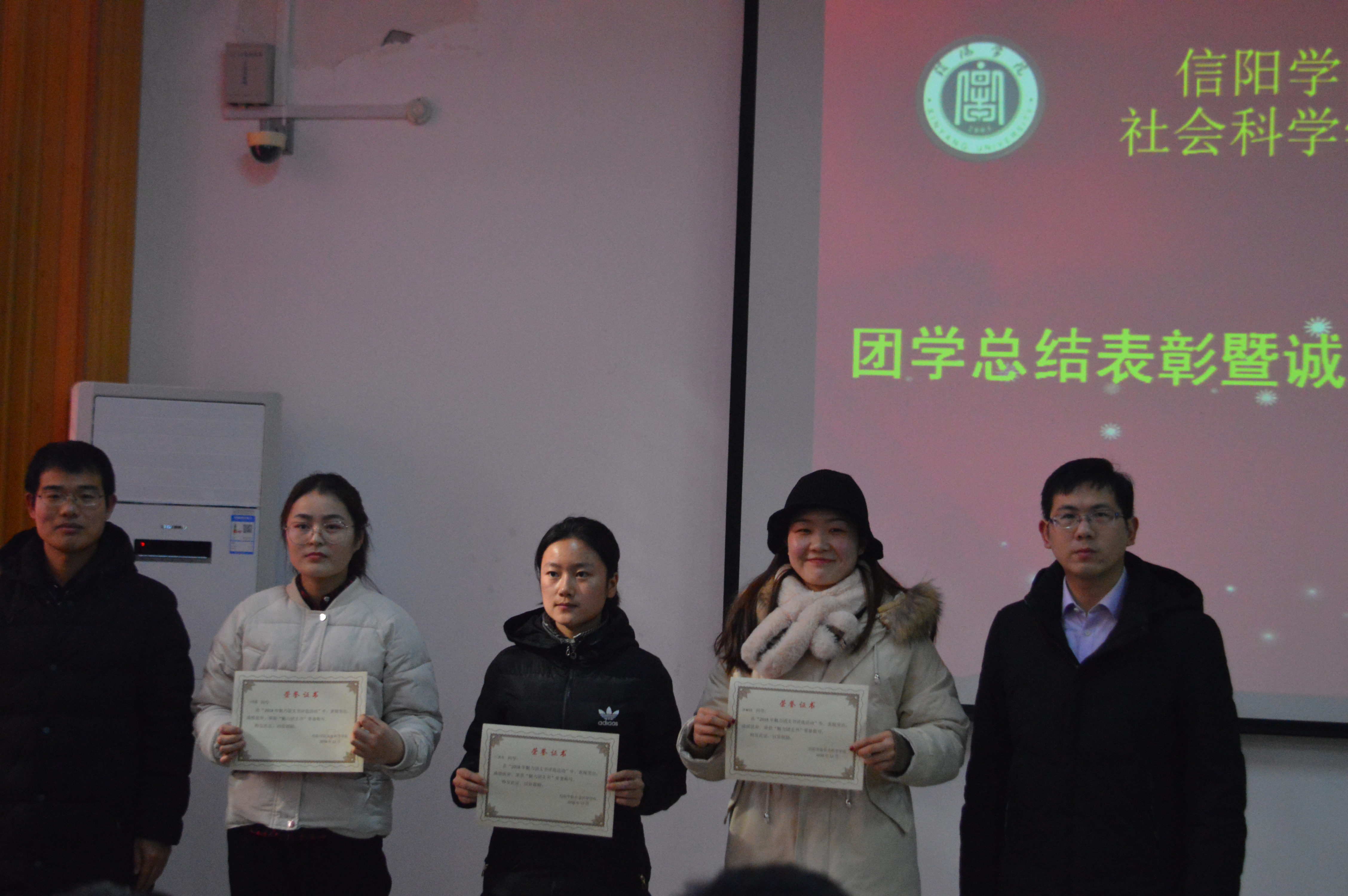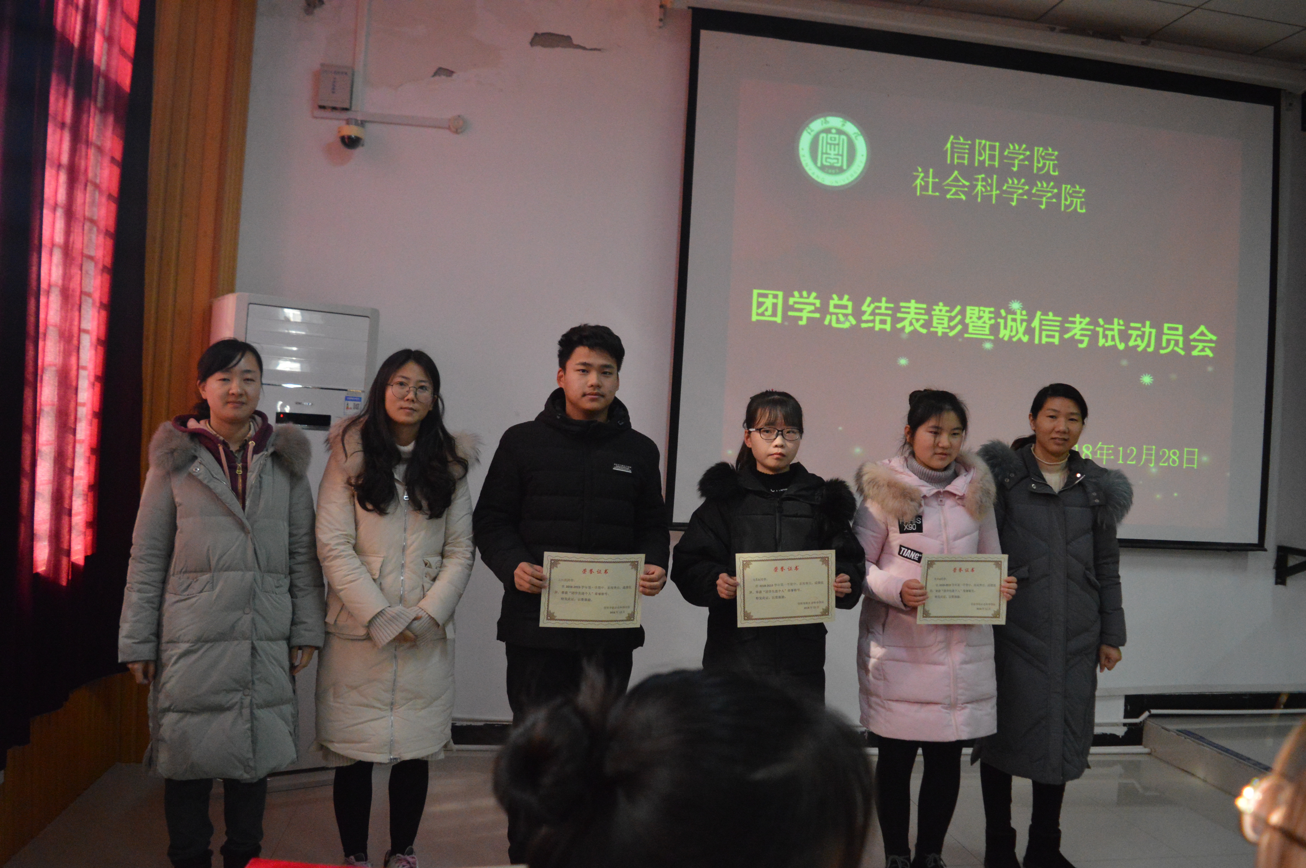 李赟书记指出,2019年即将到来,我们的学习工作任重而道远。期末考试即将到来,同学们要把弦紧绷,紧扣期末考试,合理安排时间,做到诚信考试。同时,李书记强调同学们要注意假期安全,利用寒假与家人共享天伦之乐。会上,刘颖方老师总结了本学期社会科学学院团学工作取得的总体成绩,再次强调了学生干部要以身作则,诚信考试,安全离校。徐晓琰老师宣读了《社会科学学院关于表彰2018-2019学年第一学期优秀学生和优秀班集体的决定》,有关老师对获奖学生代表进行了颁奖。