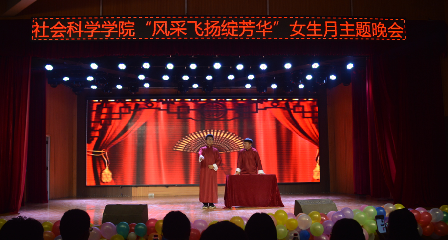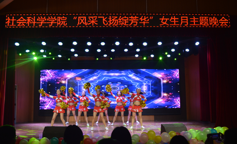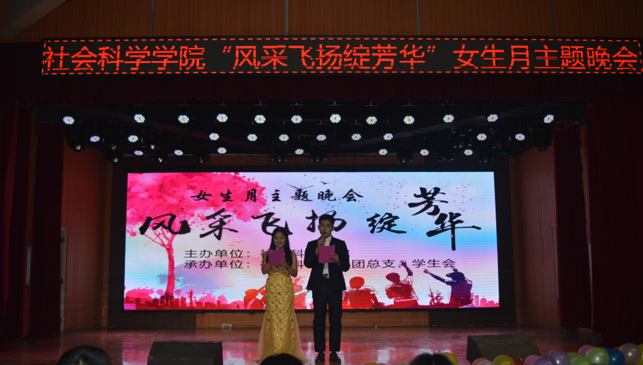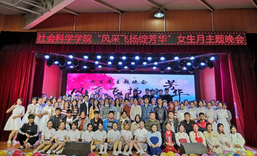 11月23日晚, 社会科学学院在大学生活动中心举办“风采飞扬绽芳华”女生月晚会。社会科学学院学工秘书刘颖方、文学院团总支书记王妍、社会科学学院团总支书记徐晓琰、李进、周余瑞、郝昊、黎骊、熊天玉、李萌老师及400名学生参加了晚会。