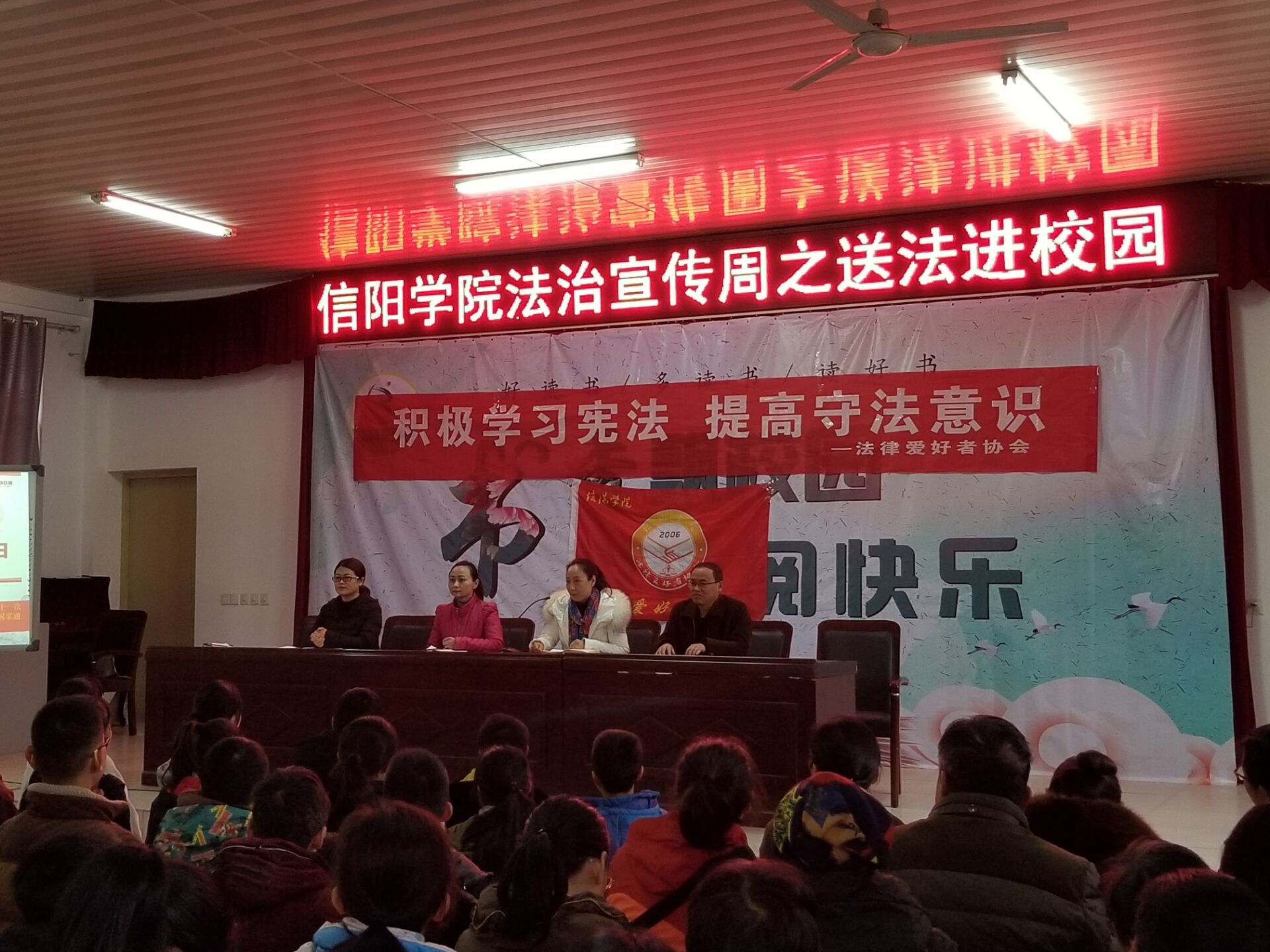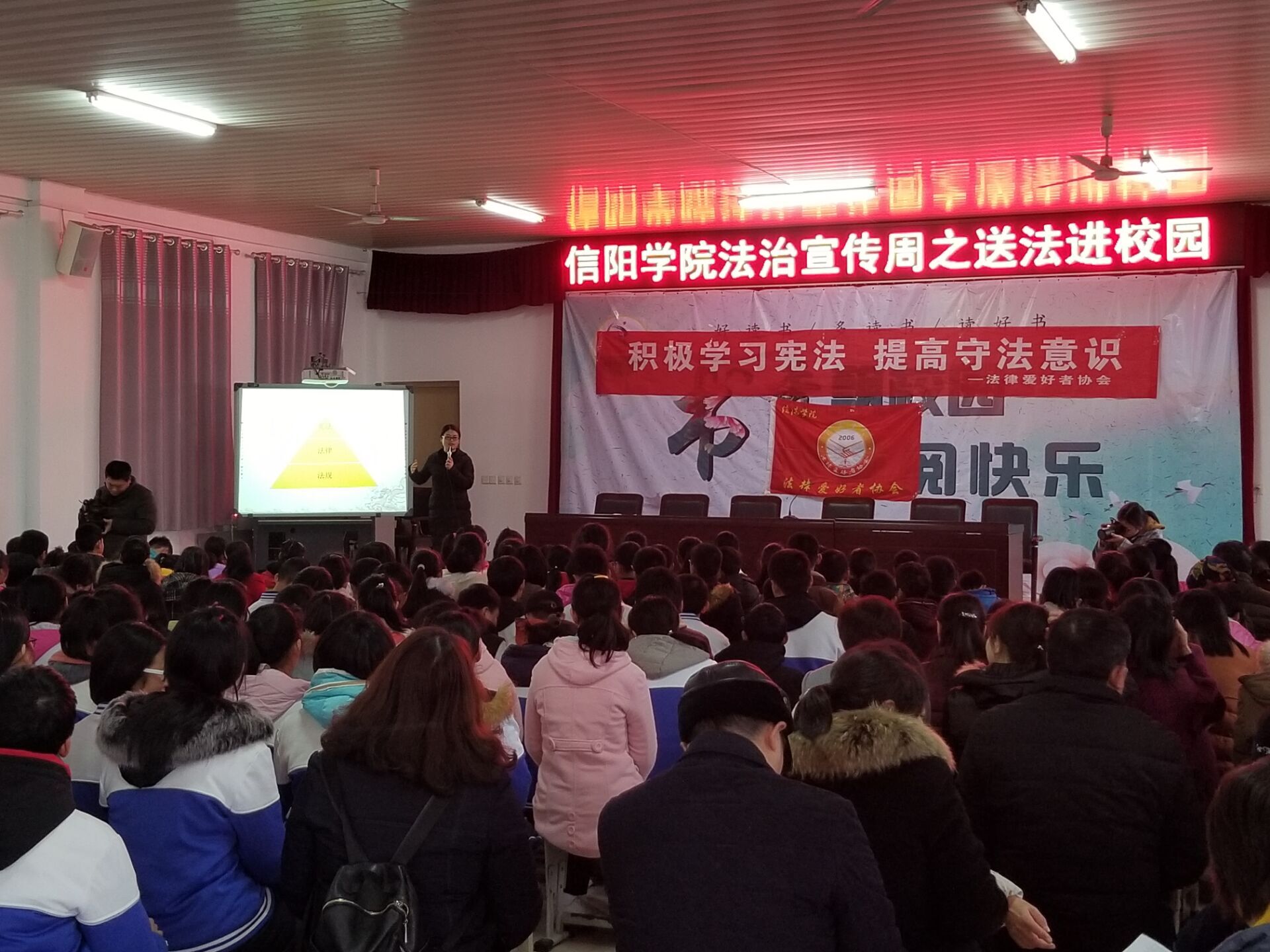 12月4日下午,信阳学院法律爱好者协会在闫春丽老师的带领下,赴信阳市二中开展“送法进校园——宪法宣讲教育”活动。本次法治教育主要围绕依法治国为主题,具体讲授了法的渊源、本质以及依法治国的重要意义。使学生初步了解个人成长和参与社会生活必备的基本法律常识,进一步强化守法意识、公民意识、权利与义务相统一观念,初步建立宪法至上、民主法治等理念,具备依法维护自身合法权益、参与社会生活的能力。