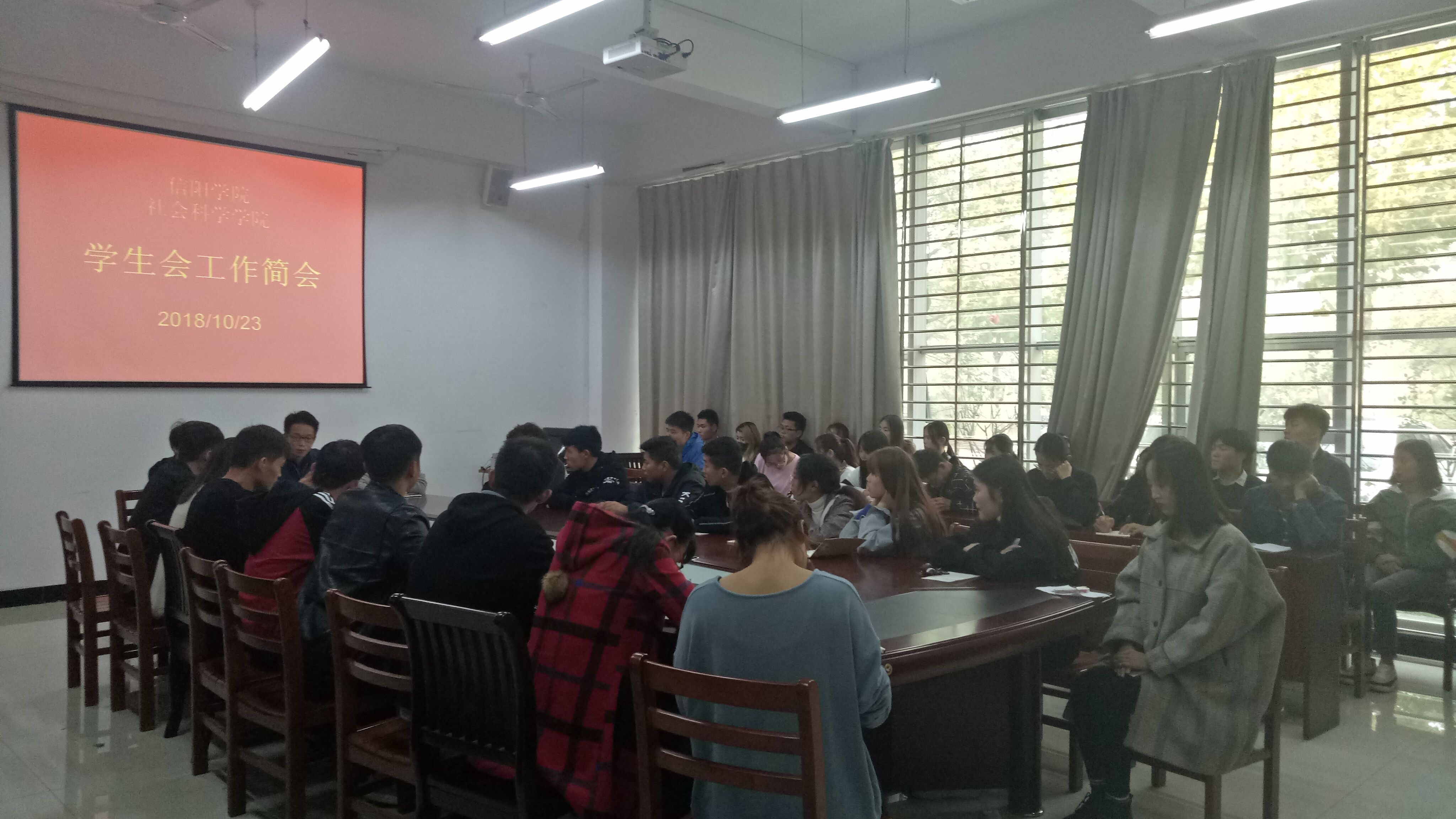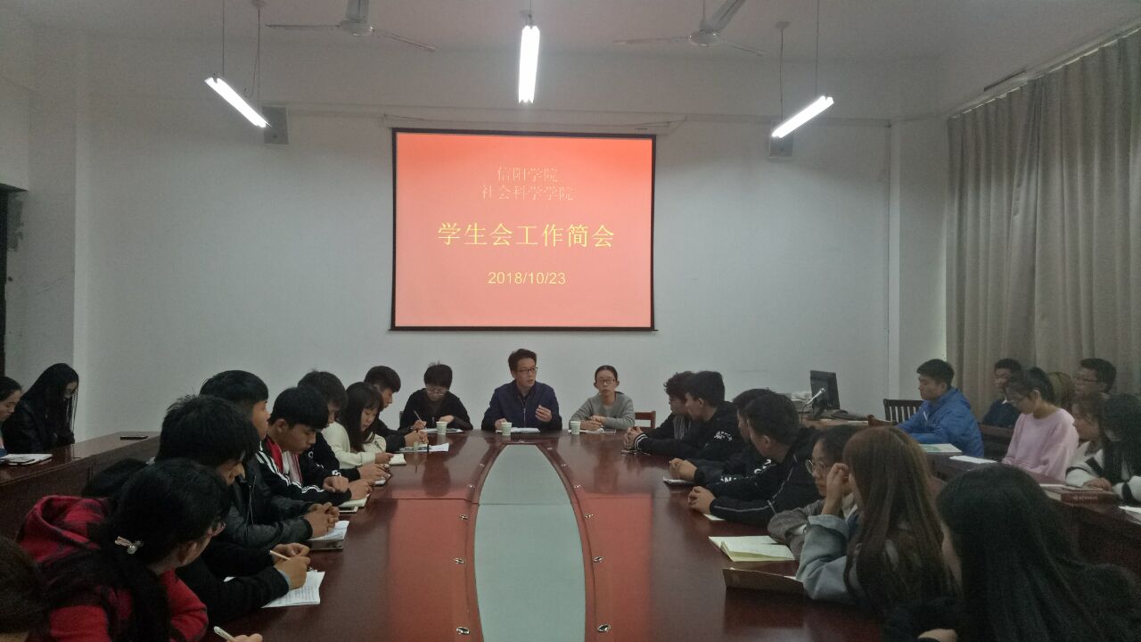 10月23日中午,社会科学学院在社科楼107召开学生会工作简会,党总支书记李赟、学工秘书刘颖方、团总支书记徐晓琰,学生会主席团、各部门部长以及社团会长共同参加了此次会议。