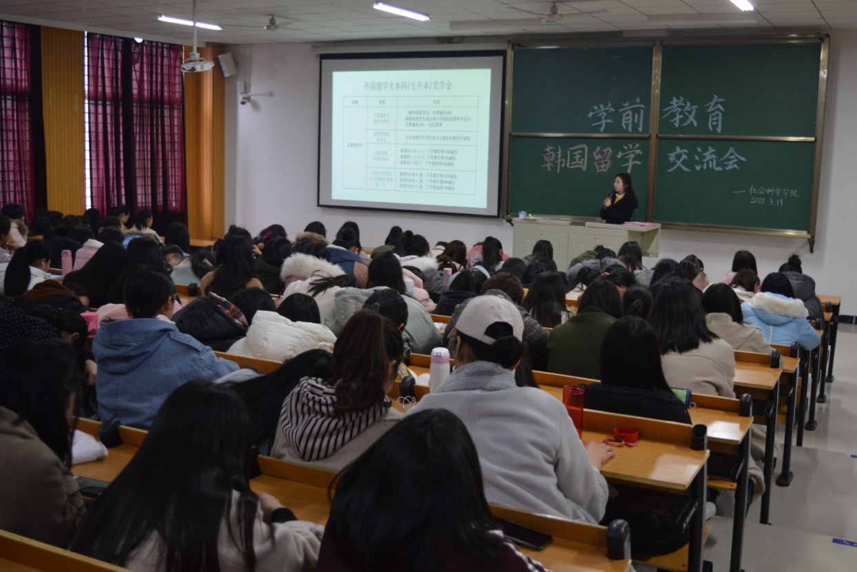 3月19日中午,社会科学学院学前教育专业关于韩国留学相关事宜交流会在社科楼219召开。交流会由国际处刘莹老师主持,三百余名学前教育专业在校生到场聆听。