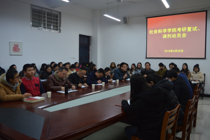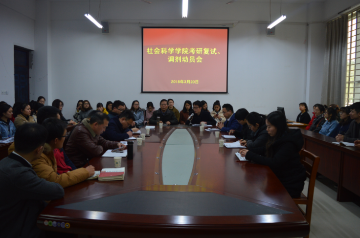 3月20日下午,社会科学学院在社科楼107会议室召开了学生考研、调剂动员会。该院全体领导班子、教研室主任、毕业班辅导员及考研过线的在校学生参加了此次会议。会议由李赟主持。、