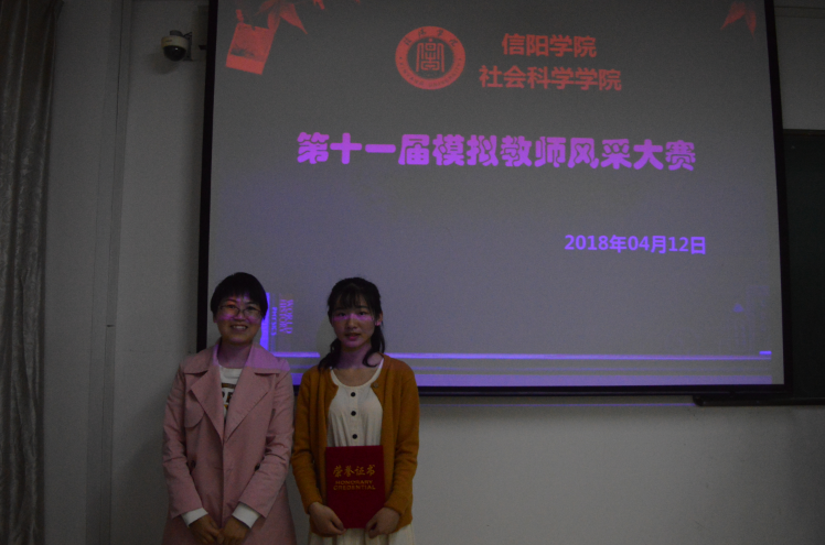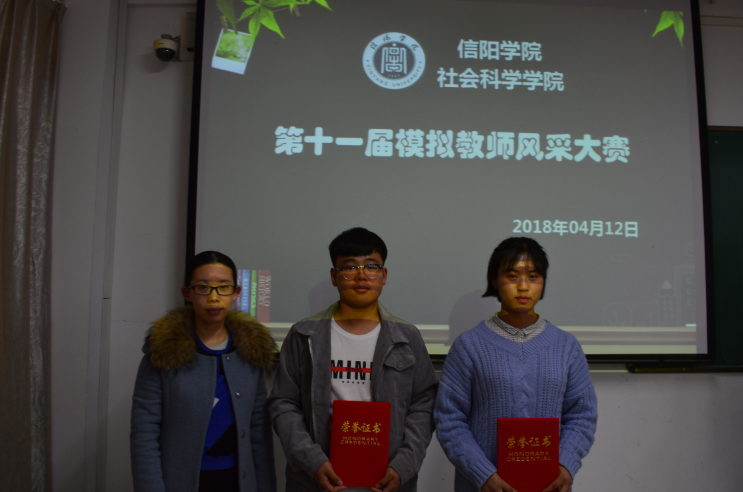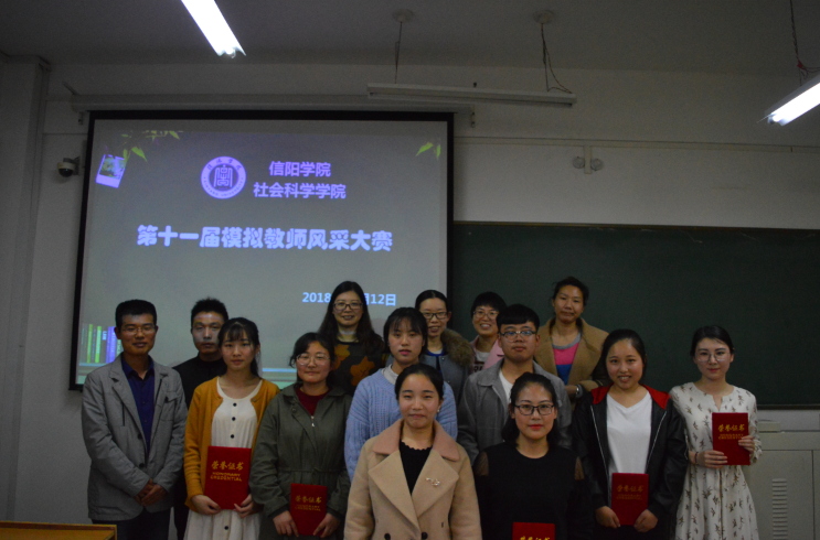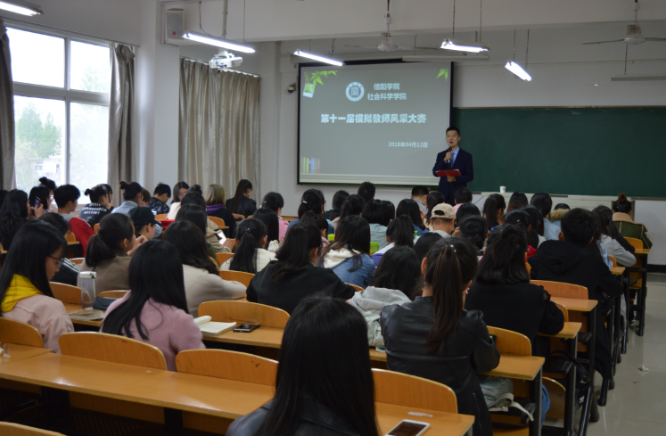 4月12日,信阳学院社会科学学院第十一届模拟教师风采大赛在社科楼316举行。担任此次活动的评委有社会科学学院学工秘书刘颖方、辅导员徐晓琰、李进、周余瑞、曹惠和陈功林,一百余名学生到场观赛,主持人由李元方担任。