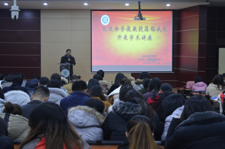 12月27日,湖北大学徐学俊教授应邀在图书馆102学术报告厅作了题为《识别管理情绪,发展健全人格》的学术报告。社会科学学院院长陈录生、党总支书记李赟、各院学工秘书、全体辅导员及社会科学学院200余名师生聆听了报告。陈录生主持了报告会。