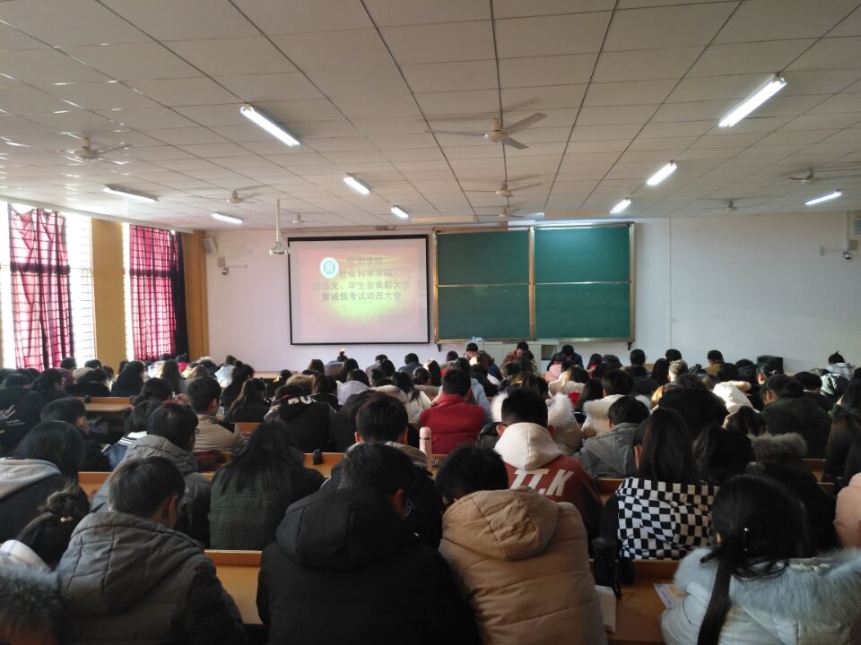1月9日中午,社会科学学院2017年度团学工作总结表彰暨诚信考试动员大会在社科楼219教室举行。党总支书记李赟、学工秘书刘颖方、团学工作负责人李进及全体团学干部、各班级主要班委参加了会议。