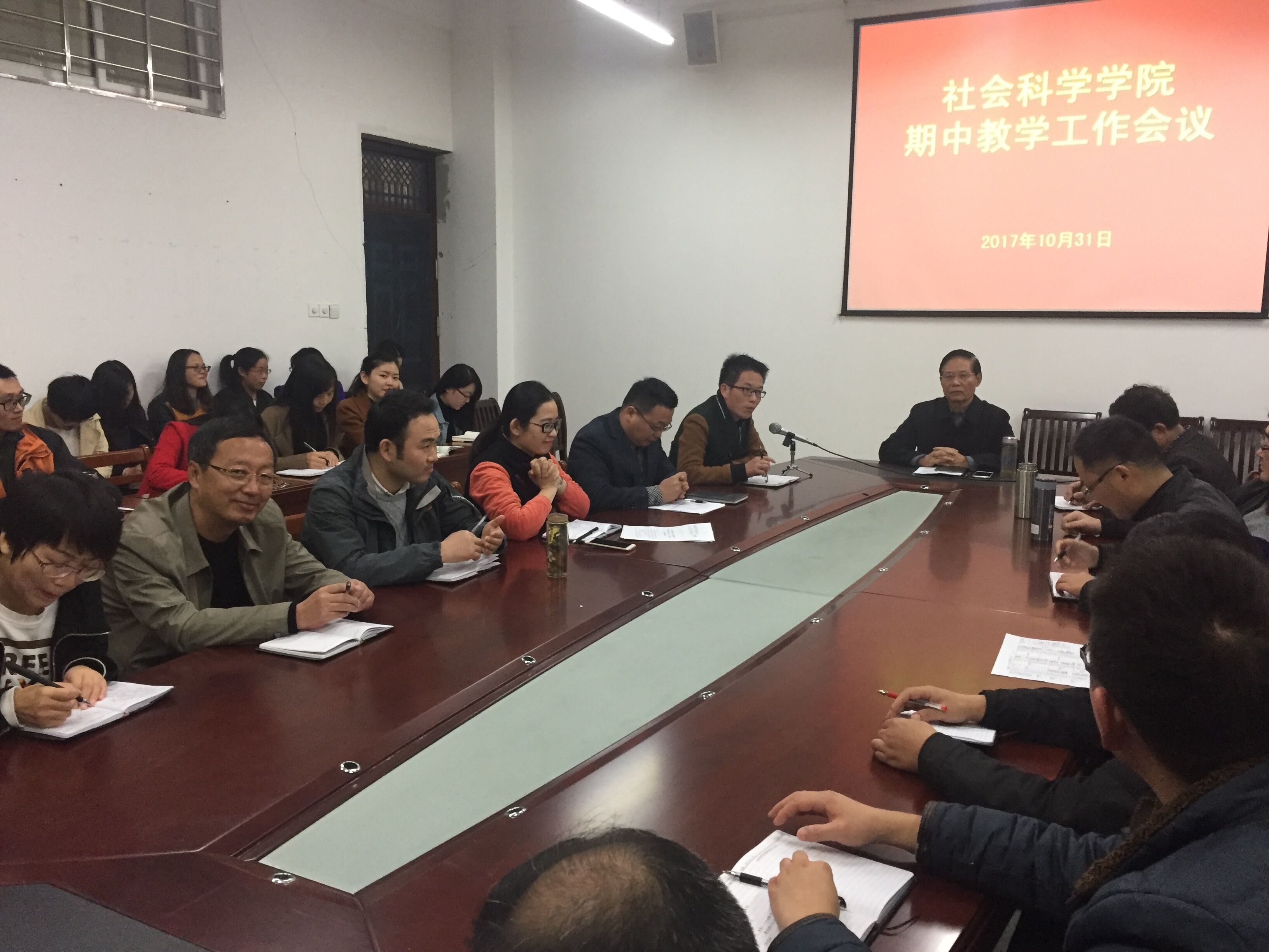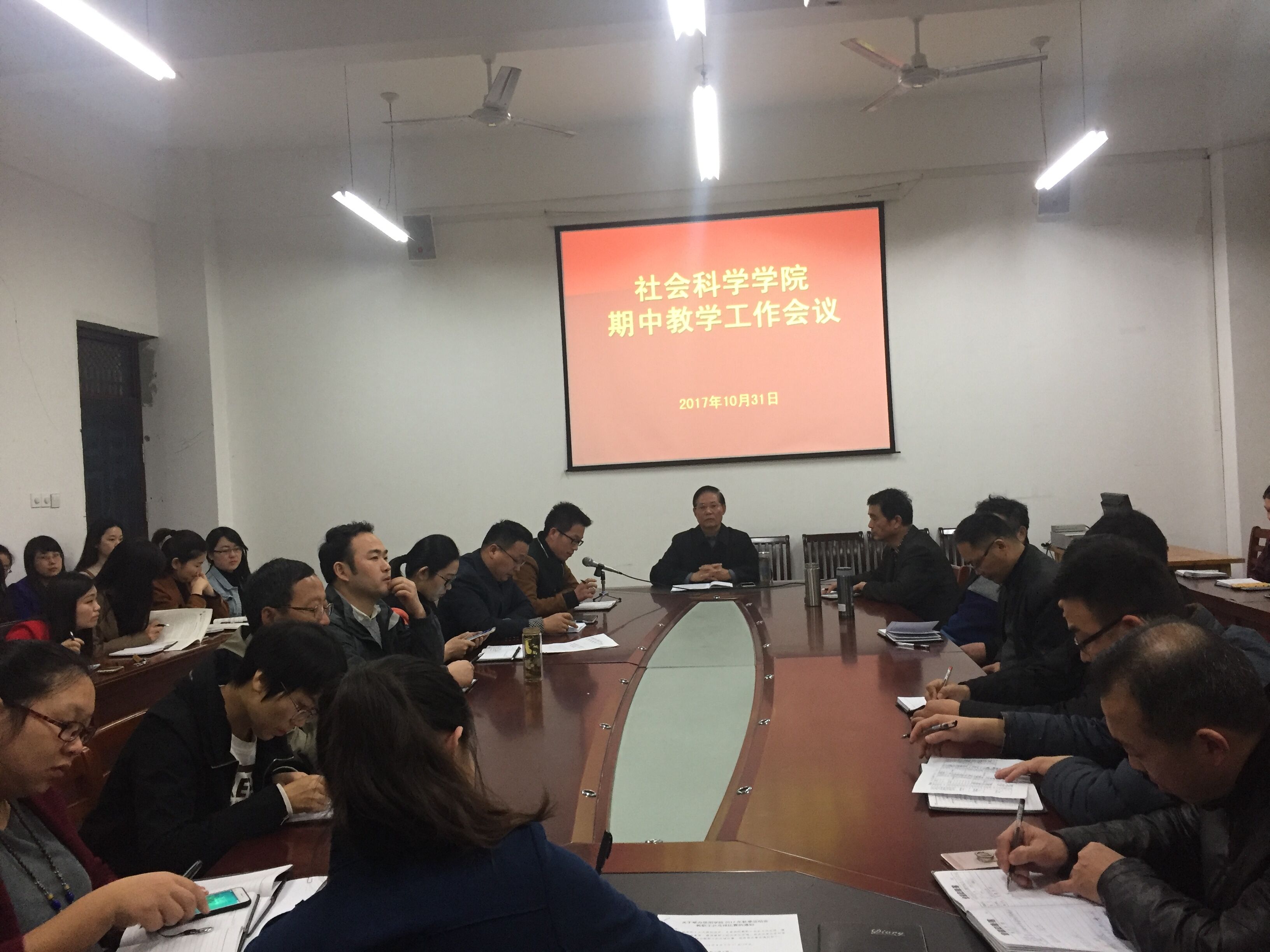 10月31日下午,社会科学学院在社科楼107会议室召开了期中教学工作会议,该院院长陈录生教授、党总支书记李赟、院长助理胡志国、各秘书干事、特聘教授、博士及全体教师参加了会议。会议由李赟主持。