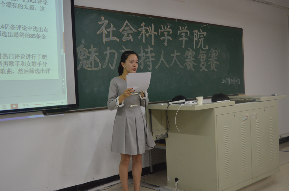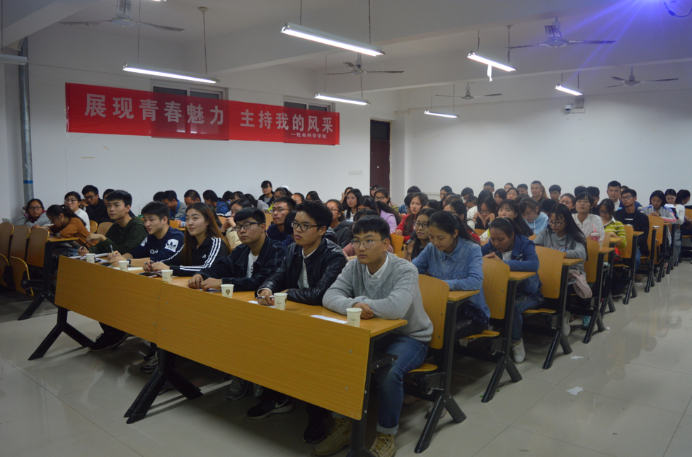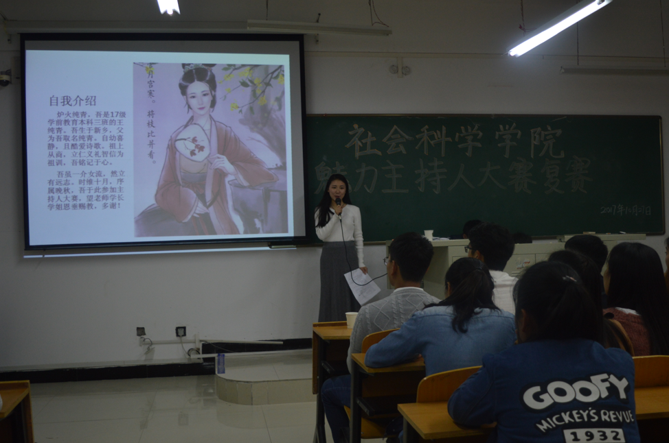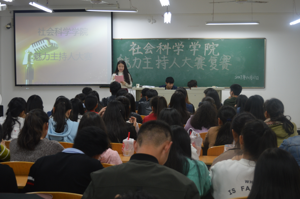 10月27日,社会科学学院魅力主持人大赛复赛在社科楼316举行。出席此次复赛的评委有社会科学学院学生会副主席韩梦杰,信阳学院广播电台台长助理于中原、朱家正,播音部部长阮奇伟,上届优秀获奖选手付彪、张卓凯,比赛由葛星主持。共有11名同学进入复赛,百余名同学观看本次比赛。