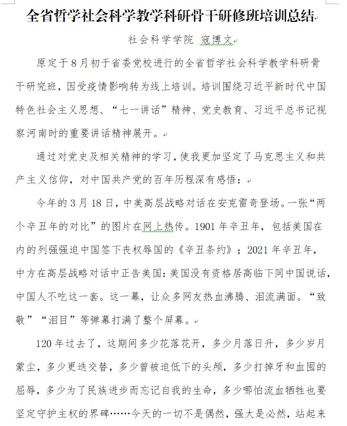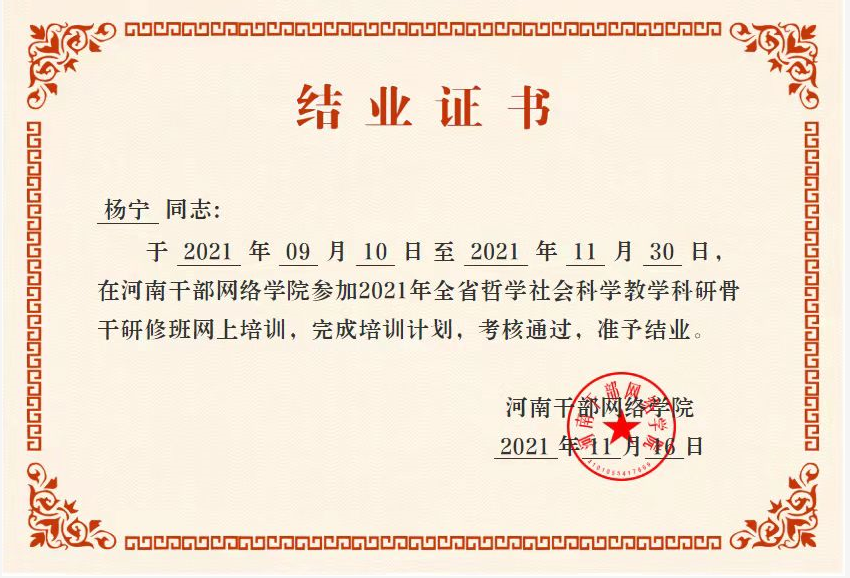 社会科学学院教师荣获2021年全省哲学社会科学教学科研骨干研修班结业证书