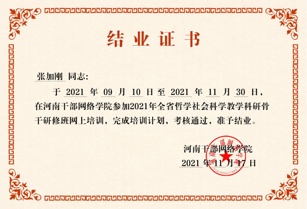 张加刚结业证书