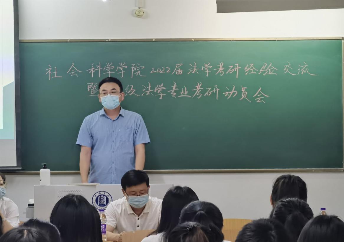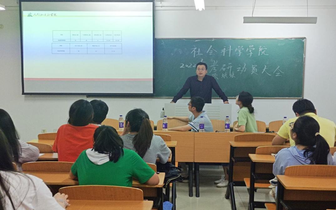 为提高我院2019级学生考研热情,充分调动学生考研积极性,帮助学生认清当前考研新形势,树立考研自信心,明确考研目标,营造良好的考研氛围。5月5日晚,社会科学学院在社科楼5楼分教室召开2023届学生考研动员大会。名誉院长、党总支副书记胡志国、法学及历史学专业考研指导老师、2022届拟录取考研学生代表、2019级法学和历史学专业全体学生参加会议。