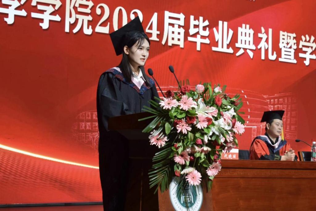 会上,河南省优秀应届毕业生、信阳学院第十四届校园明星、考取2023年国家统一法律职业资格证A证并考取北京外国语大学硕士研究生焦静薇代表全体毕业生向培养和关心他们的领导和老师表示衷心感谢,并表示在今后的学习和工作中,为母校增光添彩,为社会贡献自己的力量。
