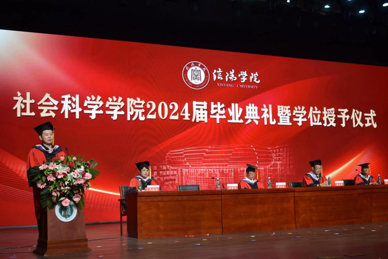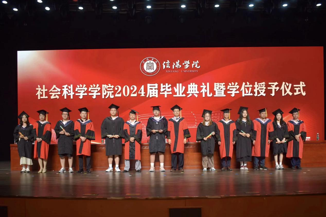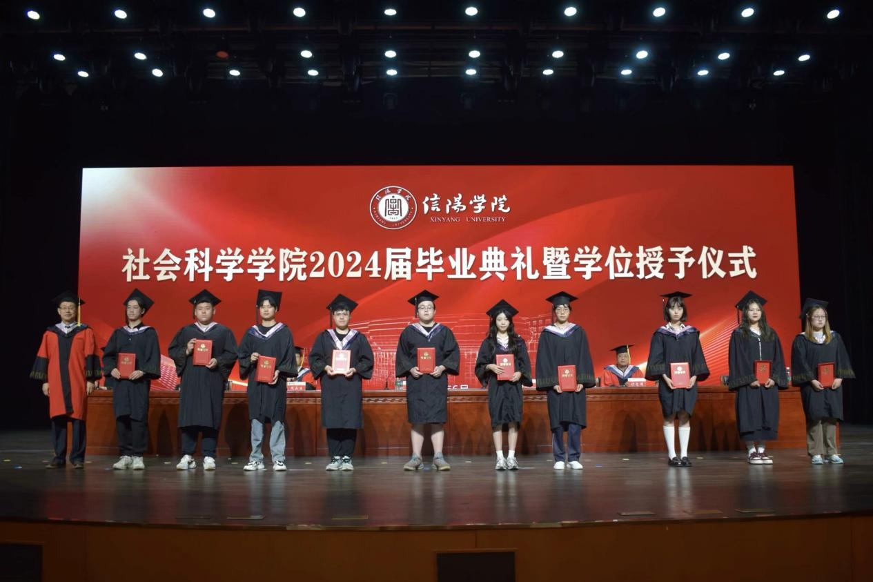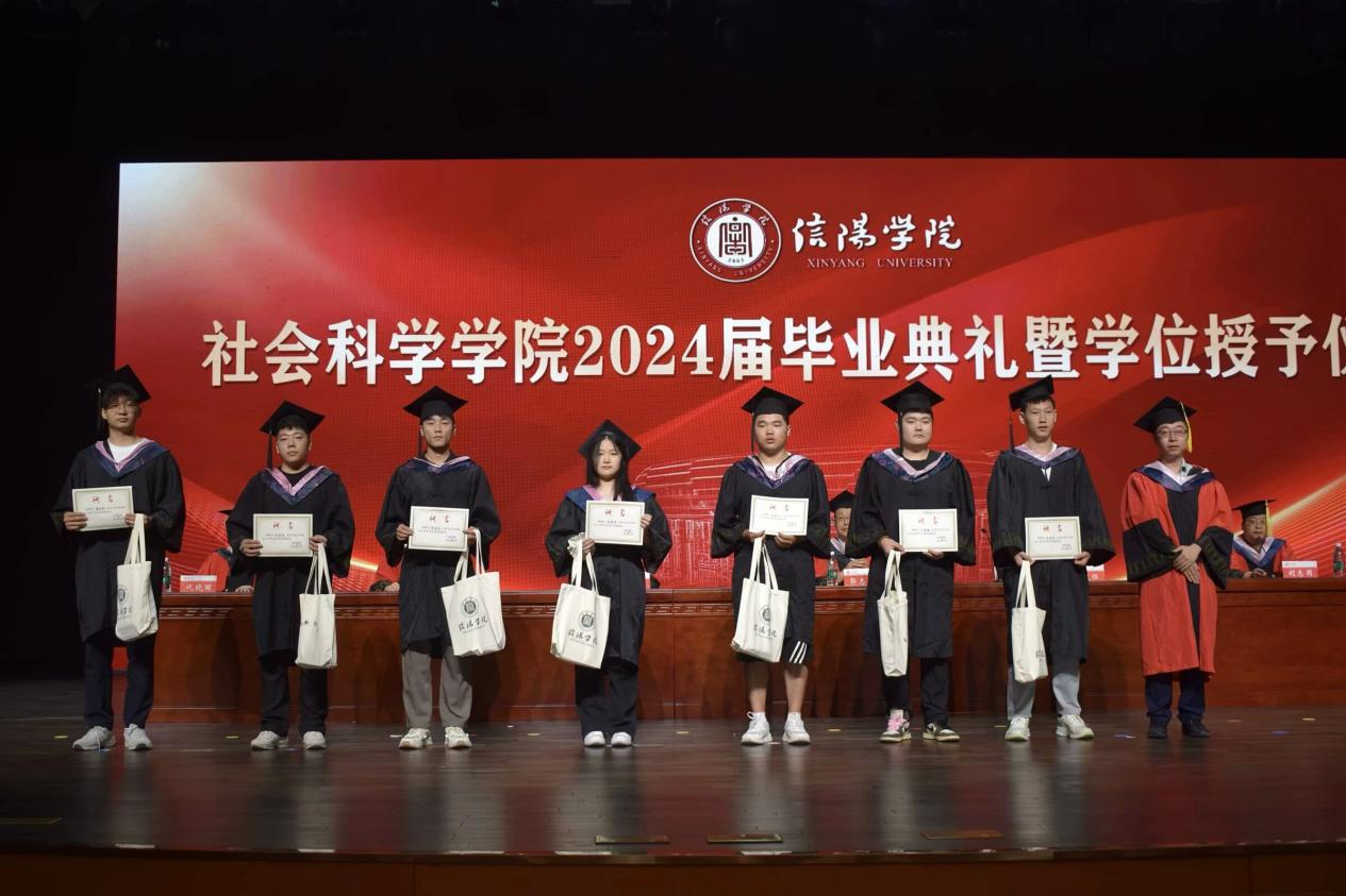 毕业典礼在庄严的国歌声中拉开序幕。寇博文宣读《信阳学院关于授予2024届本科毕业生学士学位的决定》,胡志国宣读《关于授予社会科学学院2024届优秀毕业生荣誉称号的决定》。学院领导和各位专家分别为获奖同学和校友联络员颁发证书,为全体毕业生正冠拨苏并合影留恋。