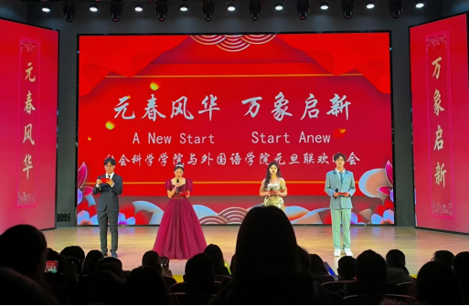 为共迎新年新气象,丰富师生的校园文化生活,社会科学学院与外国语学院于12月17日下午在教一楼113演播厅隆重举行“元春风华,万象启新”元旦晚会。社会科学学院院长郭志祥教授、外国语学院院长罗德喜教授、社会科学学院党总支书记胡志国和学院辅导员老师出席了本次活动。晚会由范佳琪、李志攀、万若兰和刘展滔主持。