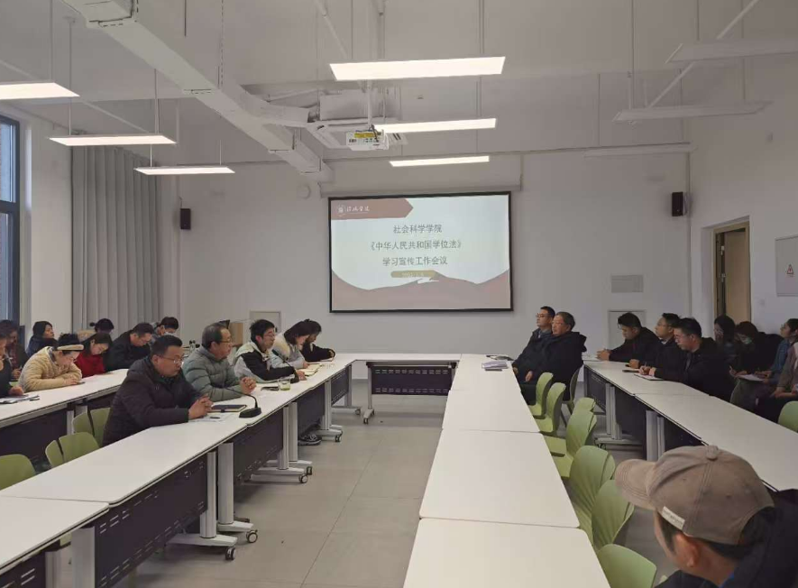2025年1月5日下午,社会科学学院在南湖校区教二楼509会议室召开了《中华人民共和国学位法》(以下简称《学位法》)学习宣传工作会议。本次会议旨在帮助全院教师全面准确把握学位授予、学位管理、学位监督等方面的具体法律内容,深刻领会《学位法》的立法精神,进一步规范学院的学位工作,提高人才培养质量。学院院长郭志祥、党总支书记胡志国、副院长寇博文及全体教职工参加此次会议。