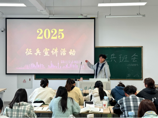 铁血铸军魂,青春献国防。为积极响应国家征兵号召,激发同学参军报国的热情,社会科学学院于2025年4月3日上午在教二楼306教室开展了2025年征兵宣讲活动。本次活动由各班负责人主持,全体同学共同参与。