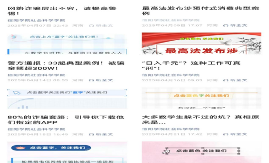 社会科学学院4月在公众号上发表“每日反诈故事”推文。通过剖析网络刷单、冒充客服、虚假购物、网络贷款等高发案例,以图文并茂形式揭露诈骗套路,累计发布防骗指南10余篇。
