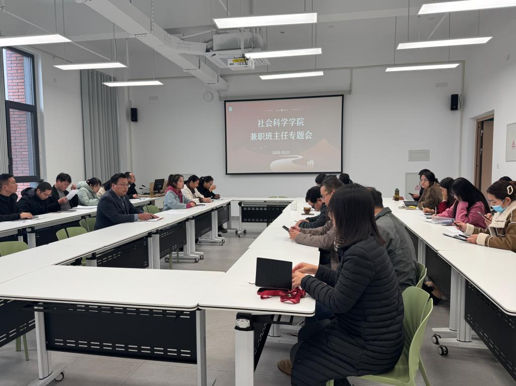 10月21日下午,社会科学学院在南湖校区教二楼 509 会议室召开2025-2026学年第1学期兼职班主任专题工作会议。学院党总支副书记胡志国、学工负责人陈苗苗与全体兼职班主任参加此次会议。会议由陈苗苗主持。