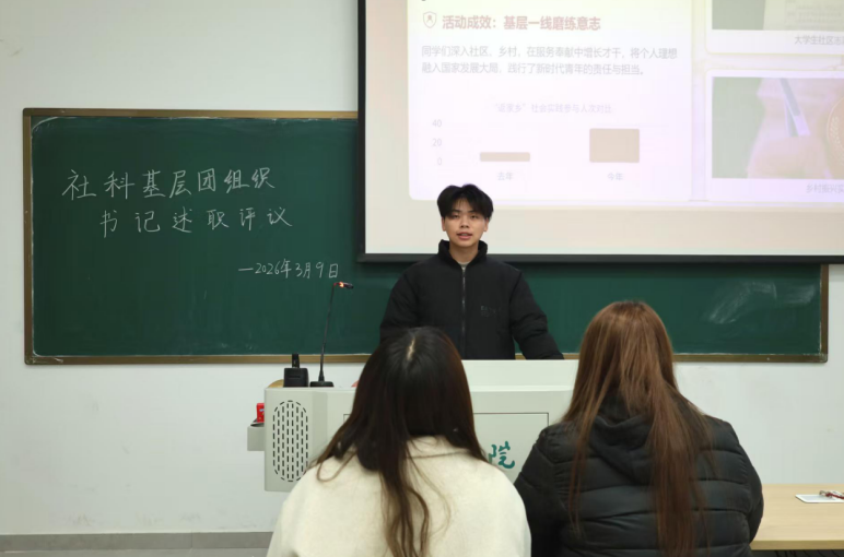 2026年3月9日,社会科学学院于教二楼105教室开展“述职亮绩担使命,青春聚力启新程”基层团组织书记述职评议活动。社会科学学院团总支书记张雪梅老师、全体团支书参会。