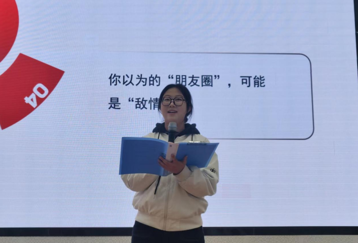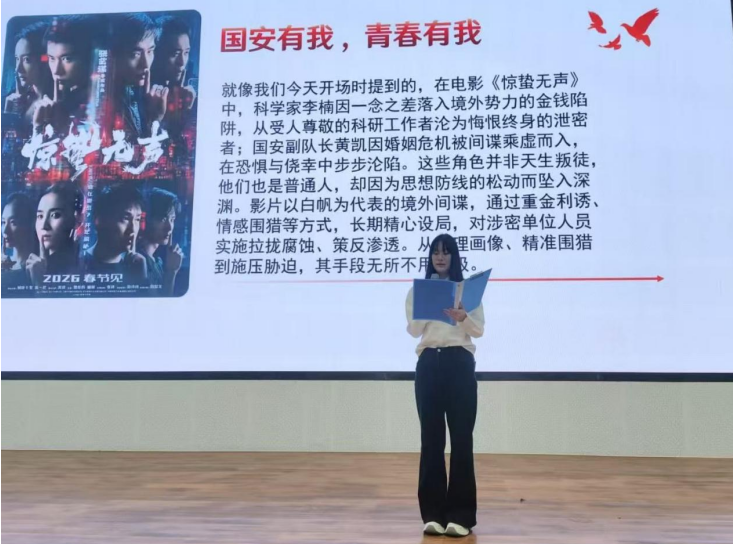 宣讲环节,五位宣讲人层层递进、深入浅出,从光影感悟、风险认知、法律准则、英雄精神、青春践行五大维度展开分享。宣讲团成员结合国安题材影片《惊蛰无声》,讲述隐蔽战线无名英雄默默坚守、无私奉献的动人故事,致敬无声坚守、致敬忠诚担当,号召同学们从身边小事做起,将维护国家安全内化于心、外化于行。