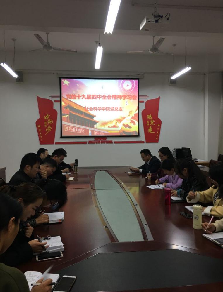 11月12日下午,社会科学学院党总支在社科楼107会议室举行党的十九届四中全会精神学习会。党总支副书记胡志国,各总支委员、党支部书记,全体班主任和辅导员参加了此次学习会。