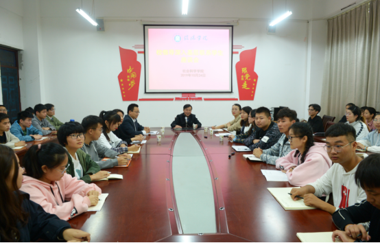 在全校深入开展“不忘初心、牢记使命”主题教育之际,为深入学习贯彻习近平新时代中国特色社会主义思想特别是习近平总书记关于教育的重要论述,进一步加强和改进我院思想政治工作,增强思政育人和管理育人的针对性、实效性,搭建学生与学校党政领导、职能部门面对面沟通的常态化机制,10月24日下午,社会科学学院在社科楼107会议室召开校领导深入基层联系学生座谈会。我校专职书记施昌海、宣传部部长李肖利、学工部部长余婷婷、社会科学学院学院党总支副书记胡志国、行政干事程娇炎、学工干事王晶、2018级历史学本科2班辅导员曹惠、2018级历史学本科2班全体同学参加会议。