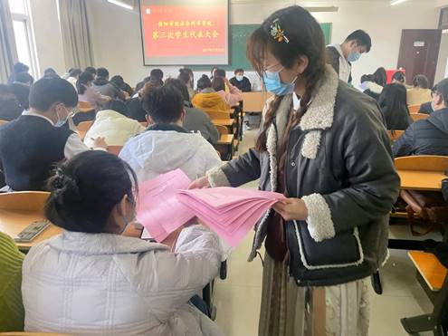 首先,由团总支书记薛姗姗宣读《关于做好信阳学院第三次学生代表大会代表选举工作的通知》,介绍学代会选举流程、公布代表名额及注意事项。其次,经监票人王涵月与计票人万帛宁、王欢欢确认后,第二次清点人数后投票开始,为保证选举公平、公正,选举会议以无记名投票方式向到会人员发布投票页进行选举,与会人员填写好选票后有序排队放至投票箱内。然后,开箱计票结束后,由监票人向大会宣布计票结果。