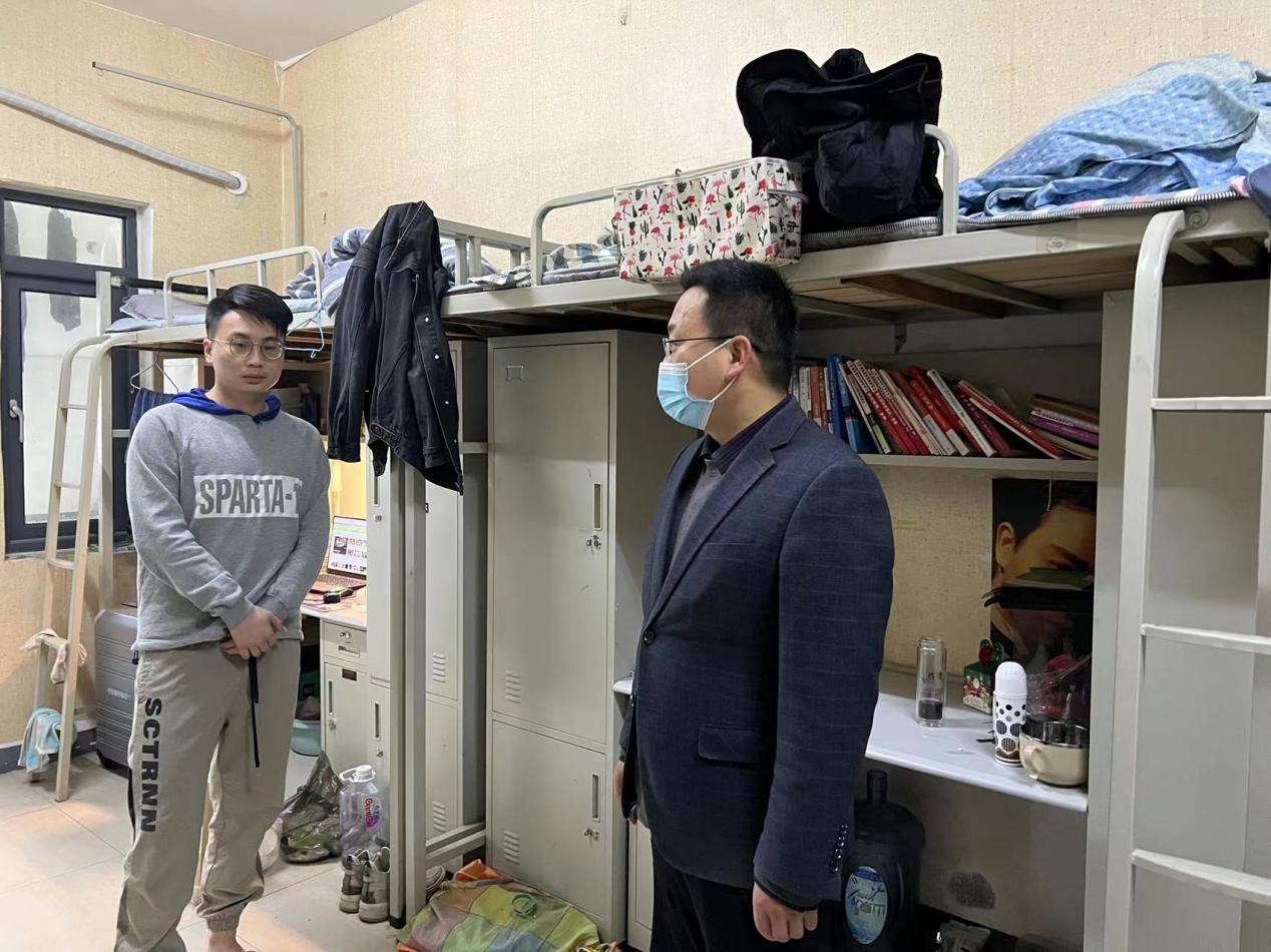 会后,胡志国和陈苗苗带领全体辅导员老师深入宿舍看望学生,询问大家的学习和生活情况,并做好疫情防控相关精神的宣传和提醒。