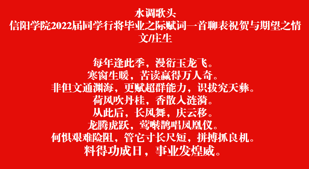 最后,全体师生共同欣赏了历史学教研室李俊恒教授为2022届毕业生所作的的诗词《水调歌头 信阳学院2022届同学行将毕业之际赋词一首聊表祝贺与期望之情》。