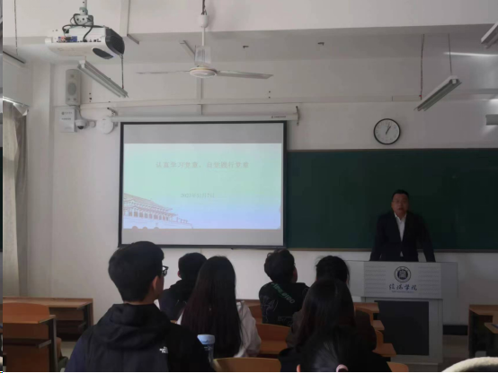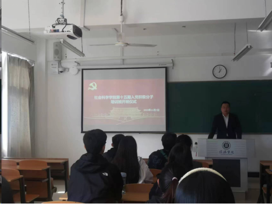 11月7日中午,社会科学学院党总支在社科楼415教室举行第十五期入党积极分子培训班开班仪式暨专题党课。学院党总支副书记胡志国、第二学生党支部书记张雪梅及第十五期全体入党积极分子参加了本次学习活动。仪式由张雪梅主持。