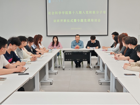 4月9日中午,社会科学学院党总支在南湖校区509会议室举行第十八期入党积极分子培训班开班仪式暨专题党课。学院党总支副书记胡志国、第二学生党支部书记杨俊东、第三学生党支部书记张傲雪与第十八期全体入党积极分子参加了本次学习活动。仪式由杨俊东主持。