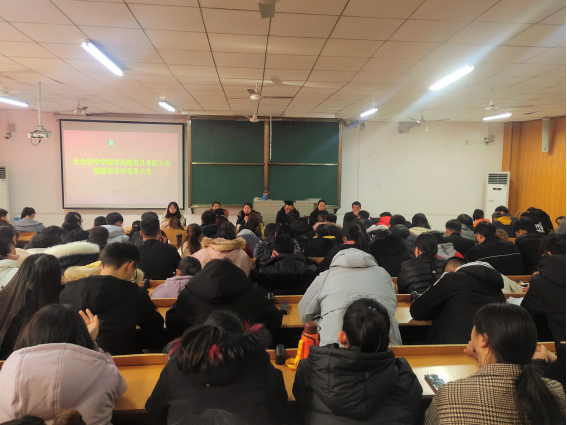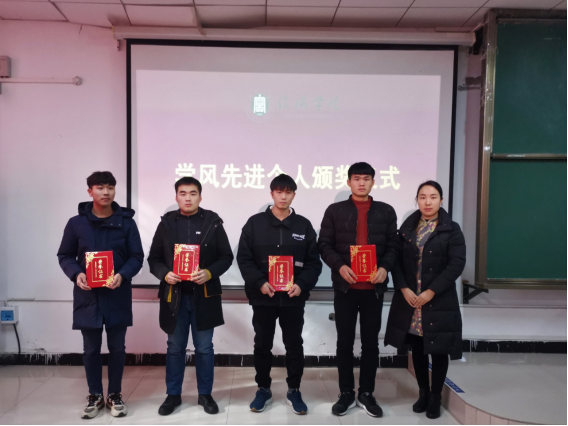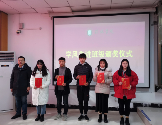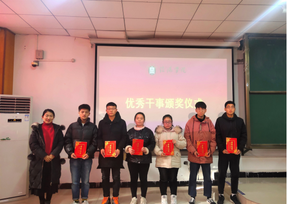 会议伊始,由王晶就我院过去学生工作进行了全面的总结,通过回顾我院在过去一学期开展的各项工作和取得成就,明确我院下一年的规划与目标,特别肯定了师生们一年来付出的努力,并对学生寒假去向、学生的安全等问题以及如何提高自身的防骗能力、保护意识等进行了强调。接着由刘雪、余洁、陈功林、曹惠依次宣读获得学风先进个人、学风先进班级、优秀志愿者、优秀宿舍、优秀宿舍长、优秀部长、优秀干事的名单并以此进行了颁奖。